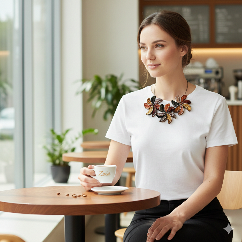 Artistieke expressie ontmoet tijdloze elegantie. De 3 Flores Caps is niet zomaar een halsketting; het is een draagbaar sculptuur. Ontworpen door de Braziliaanse kunstenares Vanessa Wagneur, transformeert dit sieraad de iconische vorm van koffiecapsules tot een geraffineerd design.