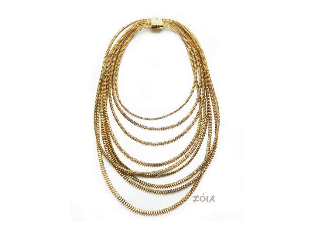 Door de lineaire structuur van een zipper los te koppelen van zijn mechanische doel, hebben we een sieraad gecreëerd dat speelt met schaduw en herhaling. De fijne vertanding van de rits fungeert nu als een glanzend sculptuur rond de hals, waarbij de oorspronkelijke materie volledig is opgegaan in het ontwerp.
